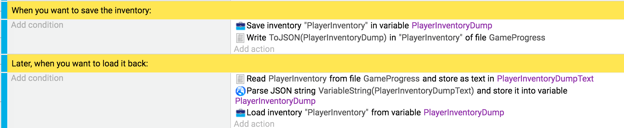 The actions "Save an inventory in a variable" and "Load an inventory from a variable", allow you to dump the contents of an inventory into a variable. These actions will be set as a structured variable. The information will be contained as children. The actions can also be used to restore an inventory from a variable.