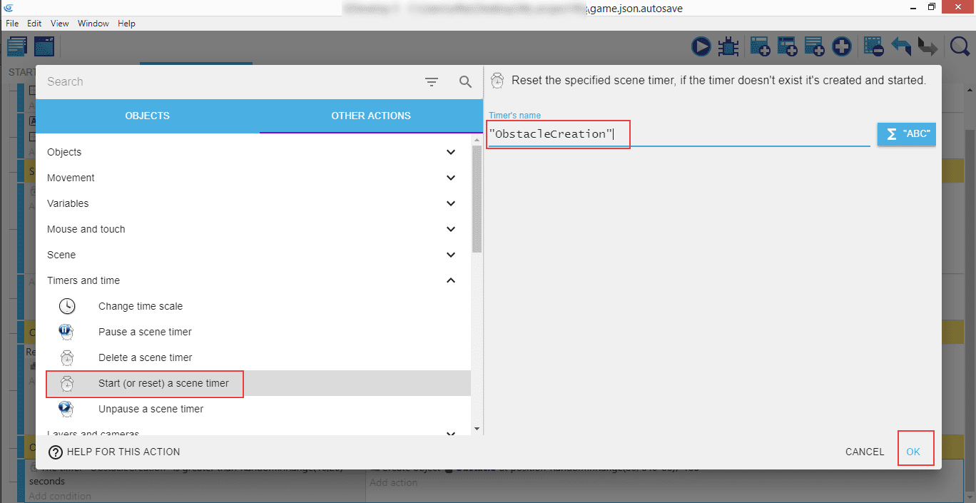 The second action to add is "Start (or reset) a scene timer" in "Timers and time", and then "ObstacleCreation" as the name.